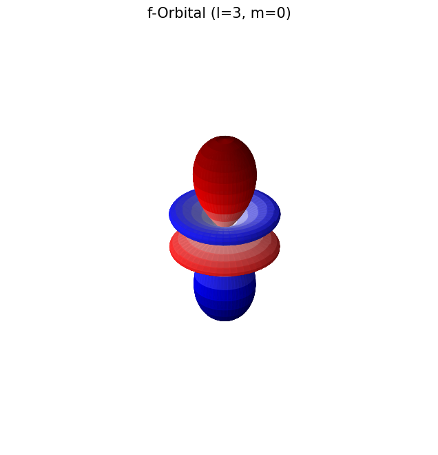 print("正在绘制 f 轨道 (l=3, m=0)... 这是一个类似哑铃穿过两个甜甜圈的形状")